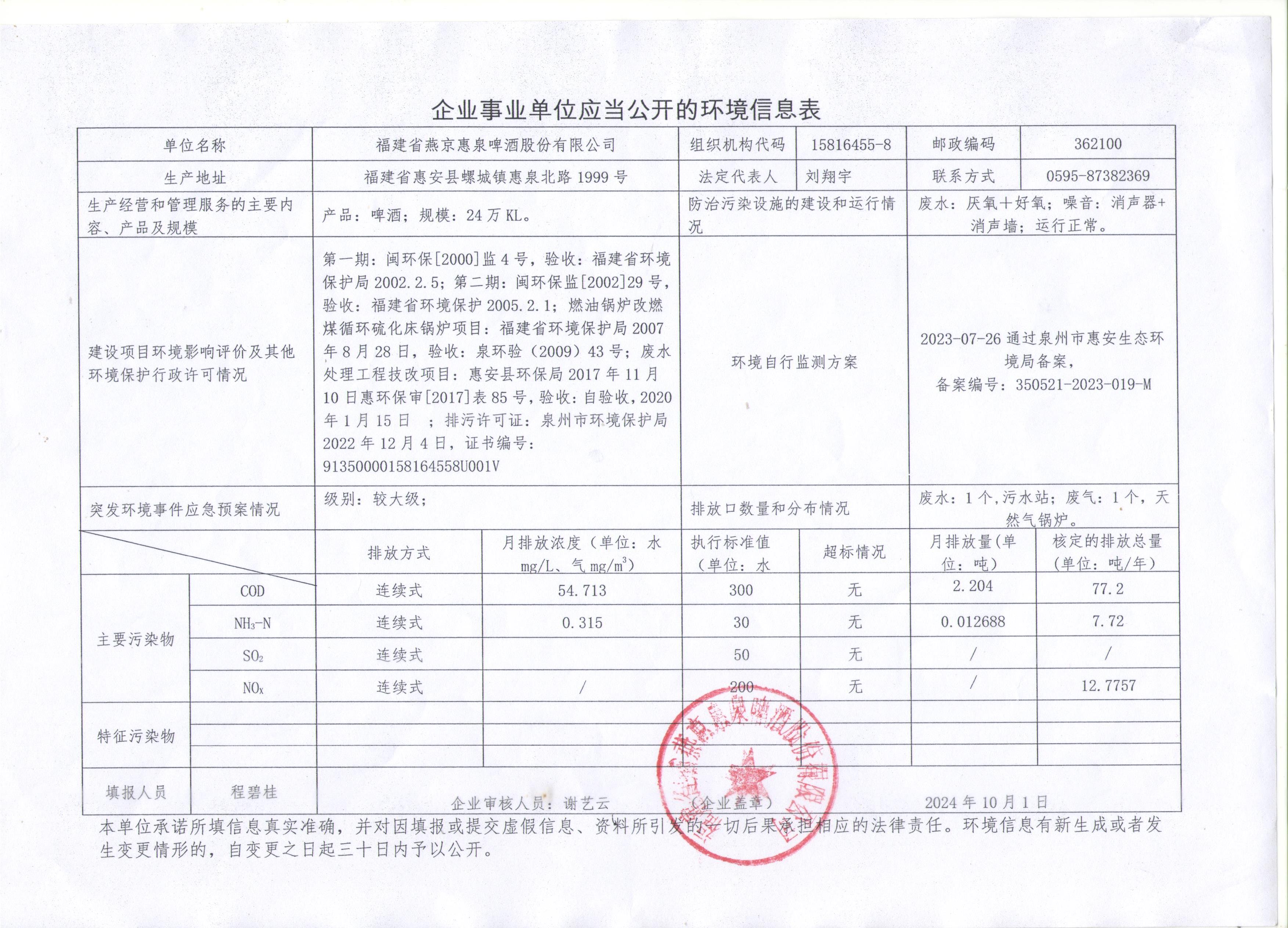 :福建省燕京惠泉啤酒公司2024年10月环境信息表