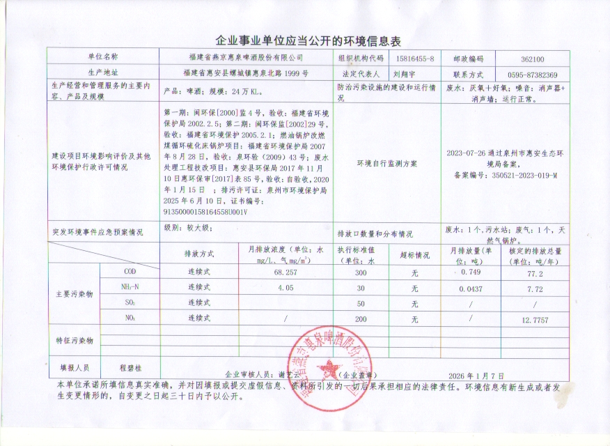 福建省燕京惠泉啤酒公司2026年1月环境信息表
