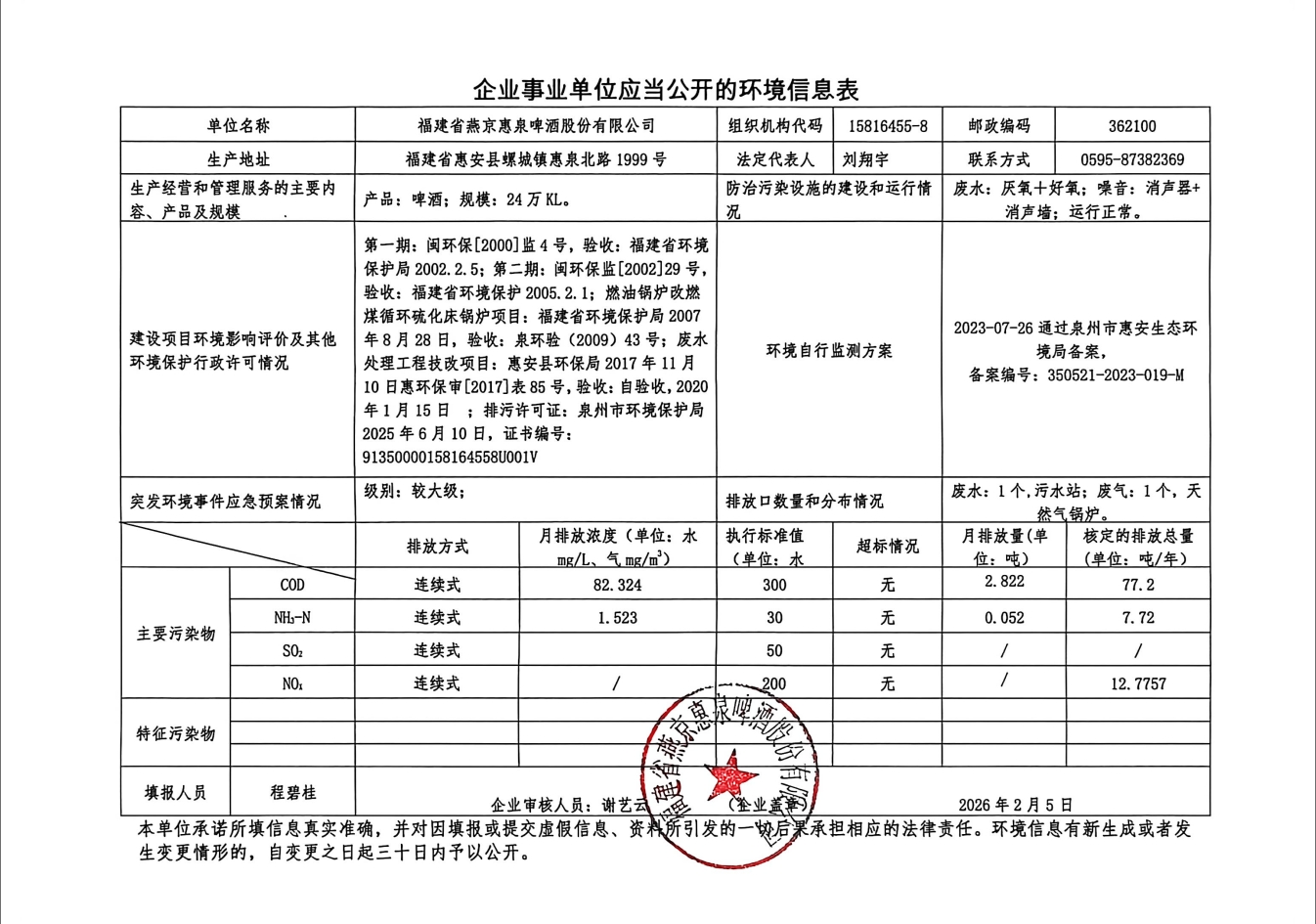 福建省燕京惠泉啤酒公司2026年2月环境信息表