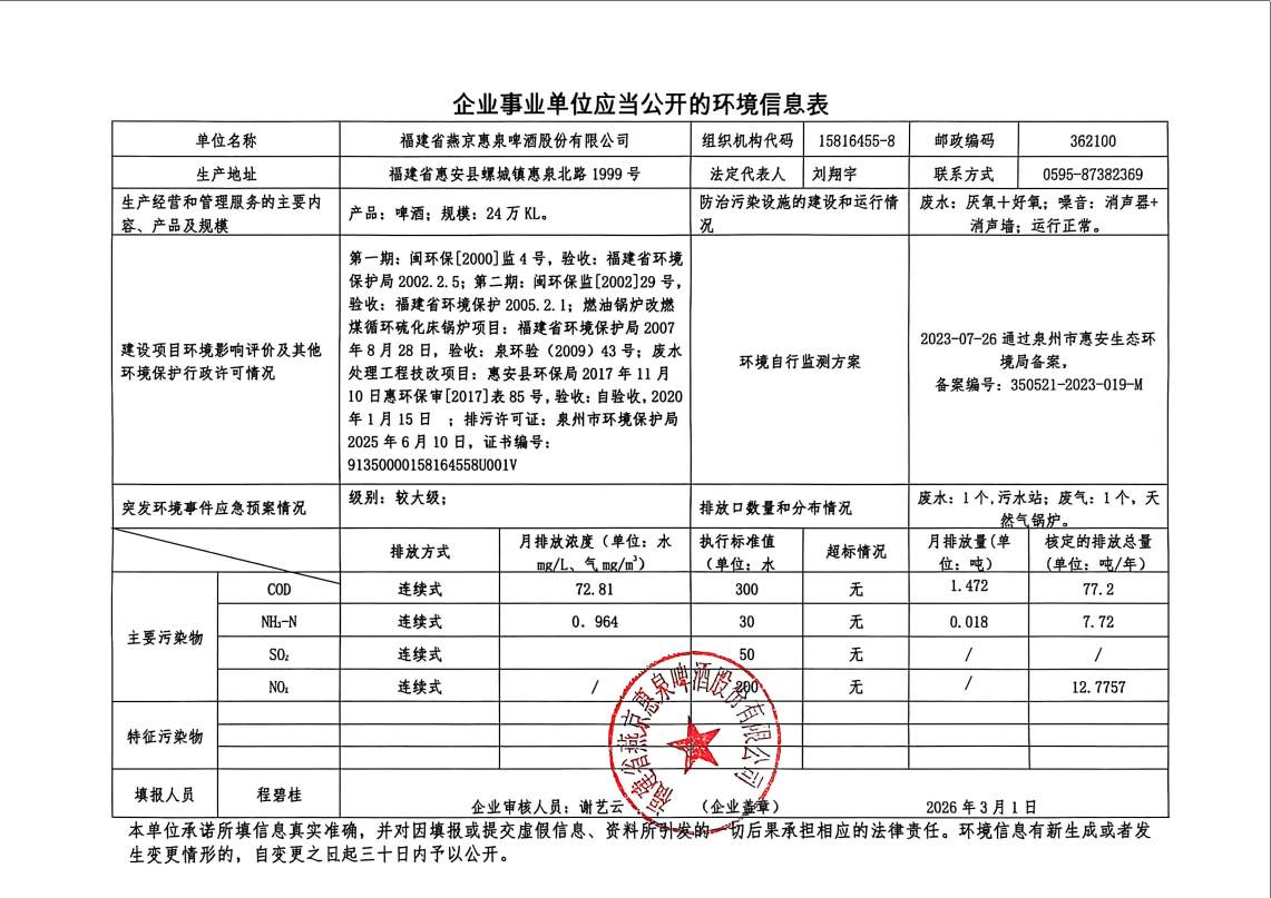 福建省燕京惠泉啤酒公司2026年3月环境信息表