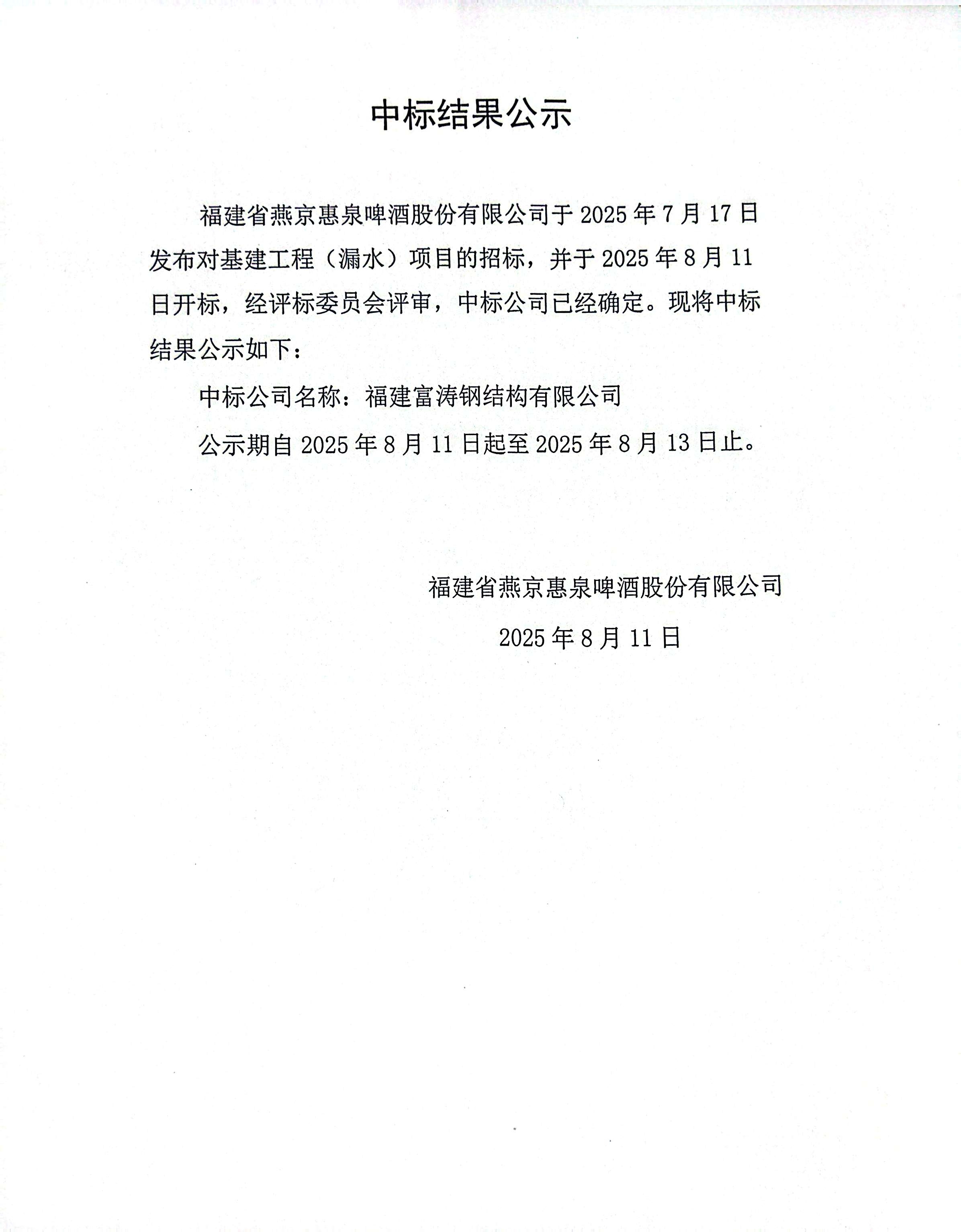 :福建省燕京惠泉啤酒股份有限公司 基建工程设计项目招标公告