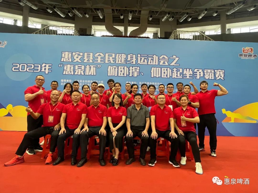 此次惠安县全民健身运动会之2023年“惠泉杯”俯卧撑、仰卧起坐争霸赛,系贯彻党的二十大报告“广泛开展全民健身活动,促进群众体育和竞技体育全面发展,加快建设体育强国”精神的重要活动,共有行业组20支队伍、群众组14支队伍总计340名运动员参赛,参与度高,影响面广,有力推动我县全民健身运动健康发展。比赛现场气氛热烈,充满着健康和激情。教练员、裁判员专业规范,运动员拼搏努力,不到最后一秒钟不放弃。由新入职大学生员工领衔、老员工共同参与的惠泉啤酒代表队,作为行业组选手参赛,并取得团体三等奖的佳绩。公司党委副书记、工会主席汪建忠赛后和大家亲切合影,其乐融融。