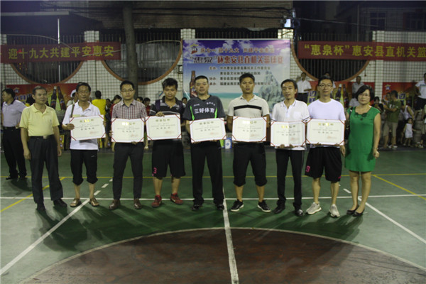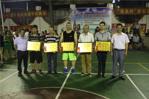 由惠安县委直属工委、惠安县文体新局主办、燕京惠泉公司党委承办、惠安县篮球协会、泉州市三好体育发展有限公司协办的惠安县县机关庆七·一、迎十九大“惠泉杯”男子篮球赛于7月20日晚在县工人俱乐部灯光球场圆满落幕!本次“惠泉杯”18支党委机关代表队历时22天、经过44场激烈的角逐,公安代表队战胜政府代表队获得本次杯赛的冠军,政府、教育、供电分获二到四名,经信、泉惠、市政、法院名列五至八名。县级相关领导和燕京惠泉公司的几位领导莅临决赛现场,观赏了精彩激烈的最后对决,并在赛后为获奖的代表队以及个人颁发了奖牌、奖品和奖金。