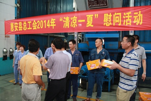 7月31日上午,惠安县副县长吕建成,县总工会党组书记、常务副主席张锦山,副主席陈惠钦、潘惠红,纪检组长刘小飞等领导,率县总工会办公室一行到我司开展“清凉一夏”防暑降温慰问活动,为一线的职工送来清凉。