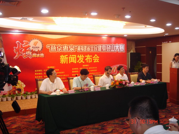 2007年8月1日上午10时,我公司携手福建省体育局、泉州市委宣传部、福州市团委和泉州市团委、泉州电视台和福州电视台、福州市体育局的相关领导以及福州等省内各界媒体记者,在泉州市世贸大酒店举行了“燕京惠泉杯”福建省全民健身登山大赛新闻发布会。