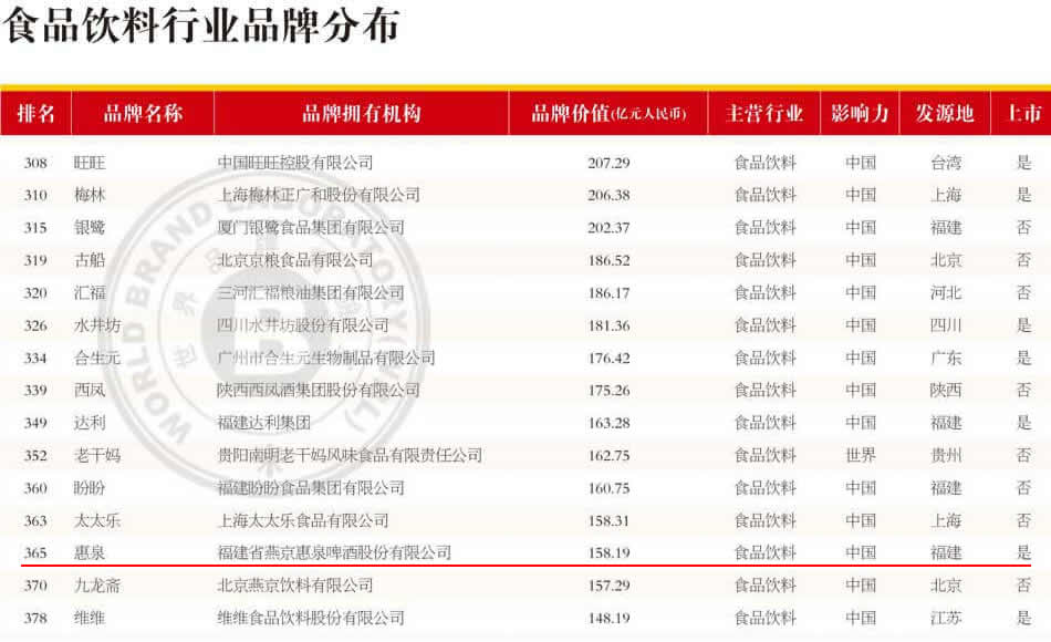 2020年8月5日,由世界品牌实验室主办的(第十七届)“世界品牌大会”在北京举办。世界品牌实验室(World Brand Lab)发布2020年《中国500最具价值品牌》报告排行榜,惠泉啤酒品牌价值从2019年136.52亿元逆势上升到 158.19亿元,总排名第365位。