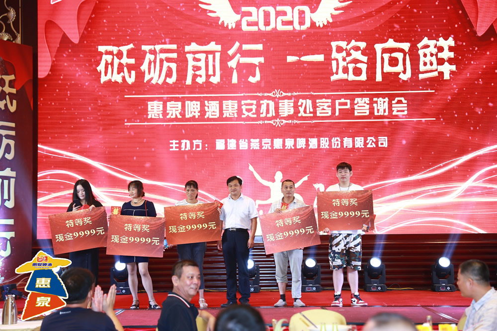 8月18日中午,蓝天如洗艳阳高照,2020年惠泉啤酒惠安客户答谢会在达利世纪酒店隆重举办,公司董事长刘翔宇和部分高管出席,700多位优秀客户代表参加盛会。在抗疫防疫的非常时期,啤酒行业受冲击的大环境下,惠安销售区的订货活动,公司中高档产品小鲜系列、11度I鲜系列啤酒受到广大客户追捧抢购,I鲜系列增量近万箱,实现市场份额逆势大增长,提升了基地市场的产品结构和品牌形象,取得厂商共赢与互惠的最佳效果。