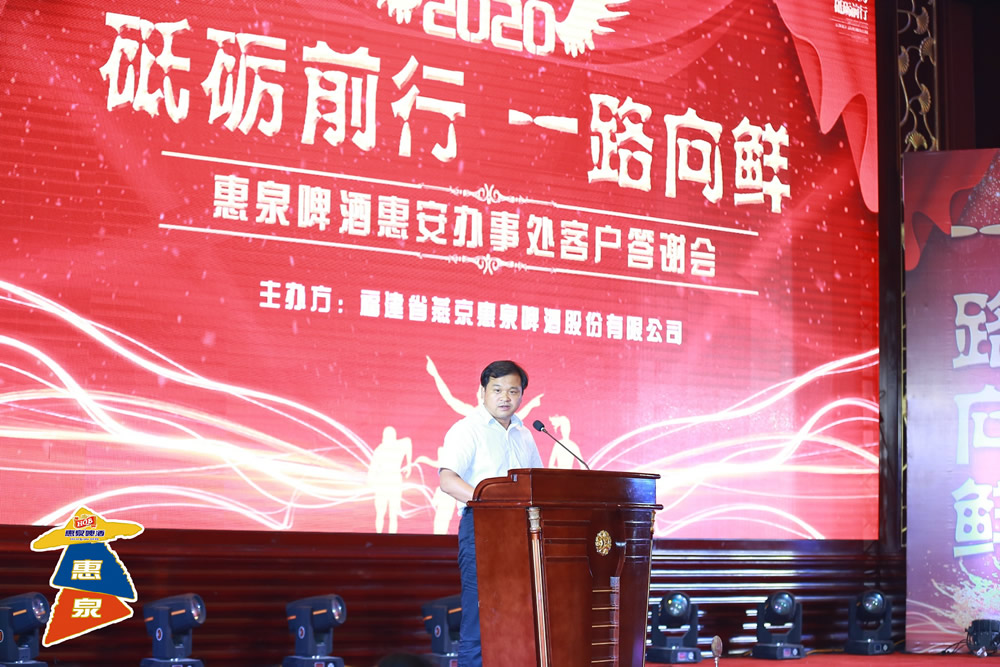 公司董事长刘翔宇在致辞中表示:“祖国万岁,惠泉长流!作为东南沿海最知名的民族品牌,惠泉啤酒在非同寻常的2020年,率先走出新冠疫情的影响,实现销量和利润逆势双增长。证明了大家对民族品牌的信赖和信心,其中离不开惠安父老乡亲30多年的支持和厚爱。惠泉的产品品质在行业中一直处于领先地位,小鲜和欧骑士啤酒获得了中国啤酒行业最高奖—青酌奖。实践证明,惠泉的产品品质是经得起市场考验的,惠泉的产品品质不落后于任何一个国外品牌的产品。惠泉啤酒将进一步提高产品品质,优化市场服务,让大家多卖惠泉多赚钱。我们坚信,我们中国人自己的品牌,一定能够为中国人民创造更美好的生活!惠泉啤酒这个惠安人民的民族品牌一定可以屹立在海峡的两岸,并越来越强!”