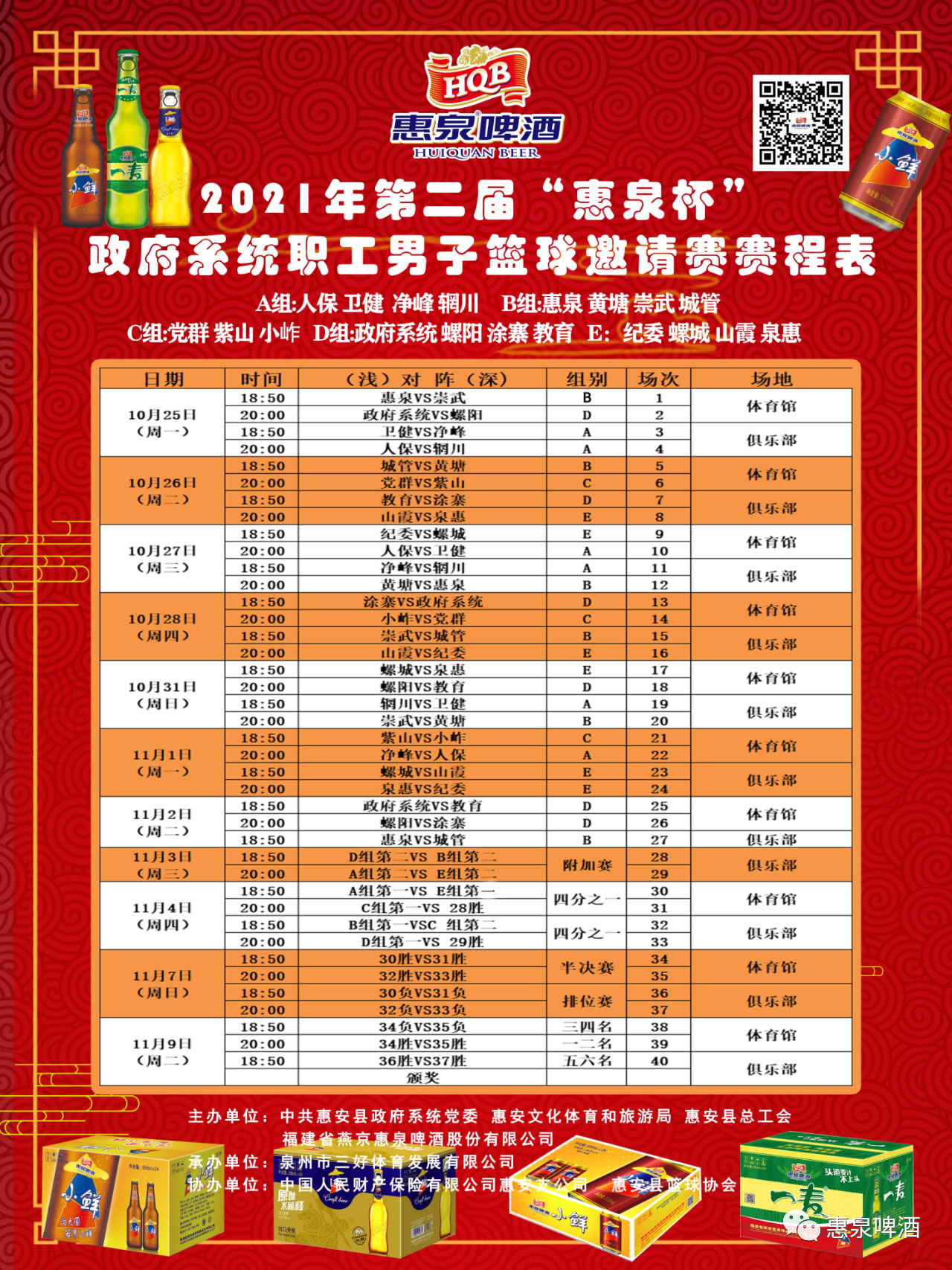 19支球队被分为5个小组,即将展开激烈的角逐。A组为人保、卫健、净峰、辋川;B组为惠泉、黄塘、崇武、城管;C组为党群、紫山、小岞;D组为政府系统、螺阳、涂寨、教育;E组为纪委、螺城、山霞、泉惠。比赛采用分组进行小组循环比赛,每个小组出线2个名额,共10个名额,然后根据事先约定的抽签规则,再由4个小组第二名进行两次淘汰赛,淘汰掉2个名额,最后剩8个名额进行四分之一决赛,然后半决赛、决赛决胜出第一名。