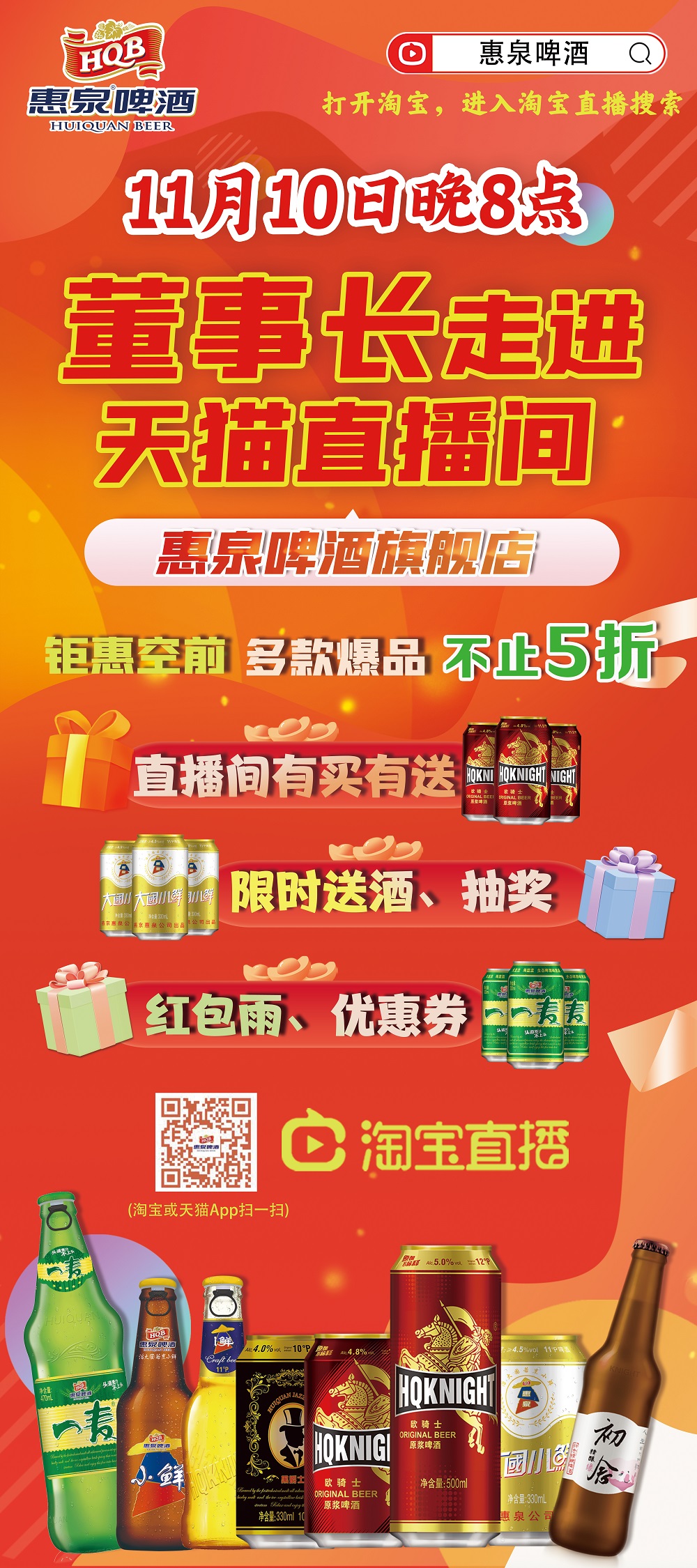 11月10日晚8点,董事长走进惠泉啤酒天猫直播间