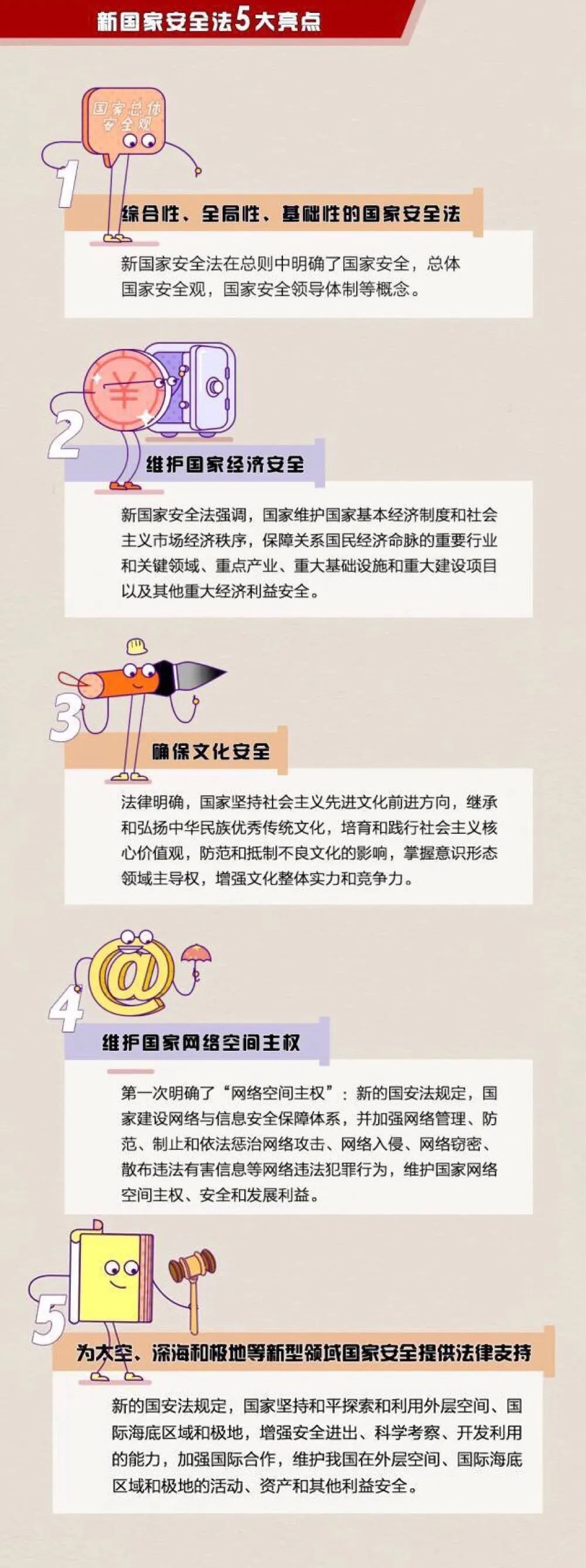 《国家安全法》主要内容包括:第1章总则,规定了国家安全的定义,国家安全工作的指导思想、基本原则、全民义务、法律责任、全民国家安全教育日等;第2章维护国家安全的任务,规定了各领域维护国家安全的任务;第3章维护国家安全的职责,规定了各部门、各地方维护国家安全的职责;第4章国家安全制度,规定了十项国家安全制度和机制;第5章国家安全保障,规定了法治、经费、物资、人才等一系列国家安全保障措施;第6章公民、组织的义务和权利,规定了公民和组织维护国家安全应当履行的义务和依法享有的权利;第7章附则,规定了《国家安全法》的施行日期。